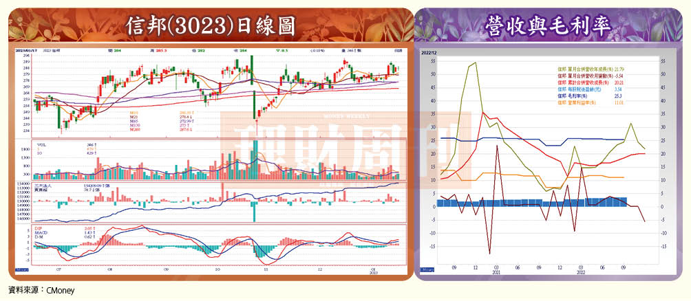 法人機構指出,信邦近年快速切入電動車相關應用領域,二○二一年,電動車占整體車用營收比重約四○%,去年則進一步提升達超過六○%占比,預期二○二三年,還會再更加擴大。此外,車用產品毛利貢獻更佳,目前僅次於工業、醫療水準。伴隨電動車營收占比提升、消費性電子同步下降,產品組合持續優化的效益加持之下,樂觀看待信邦今年毛利、獲利表現,料將可持續穩健成長。