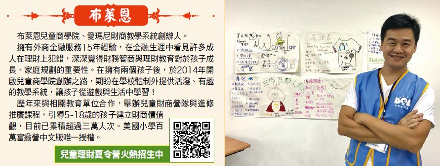 因此,這也是布萊恩兒童商學院的核心價值之一:「好情商=好財商」。但如何教導10歲孩子認識「投資」呢?布萊恩引以自豪的表示並舉例,我們知道知名品牌可口可樂在全世界一天可售出1億8000萬瓶飲料,假設一瓶可口可樂可賺10美分,公司一日的現金流就有1800萬美元,如此龐大的商機不是人人皆可辦到的,這時可與孩子解釋何謂股東與消費者的區別。透過以上方式,讓孩子從最熟悉的事物直接學習投資觀念,每當孩子在賣場看見有人正在購買一箱可口可樂,便能立即反應出投資獲利的含義,思維也就變得不一樣。