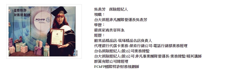 台大保經非凡團隊營運長吳燕芳,就是一位優秀的保險經紀人。從事保險業十六年,她致力在台灣推動保險經紀人的概念,希望將她所堅持的信念與價值傳遞出去,幫助更多的民眾對未來有更完善的風險規劃。吳燕芳認為,保險經紀人是站在社會大眾的立場,是非常值得發展的產業。她心目中的保險經紀人,應該始終將客戶當成最重要的,並堅持職業道德良心。