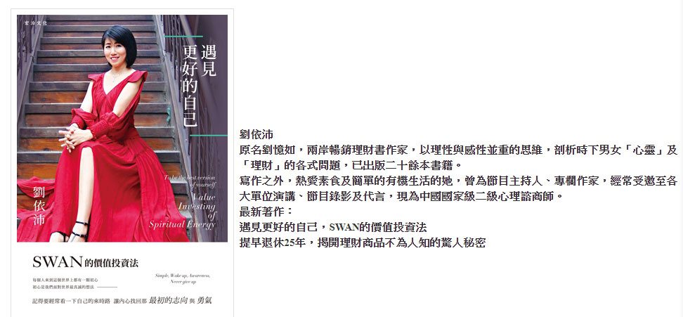 劉依沛說,過去她寫理財書,可以為銷售量而寫,但是現在她下筆時,會去思考,什麼是對大家有益的,以及對讀者有什麼深遠的影響,這樣會不會只利他而不利己…等等,劉依沛說,當你做有益於別人的事,別人會因為你的善行善心,也會希望你的事能夠成功,相對來說,你的貴人就會越來越多。