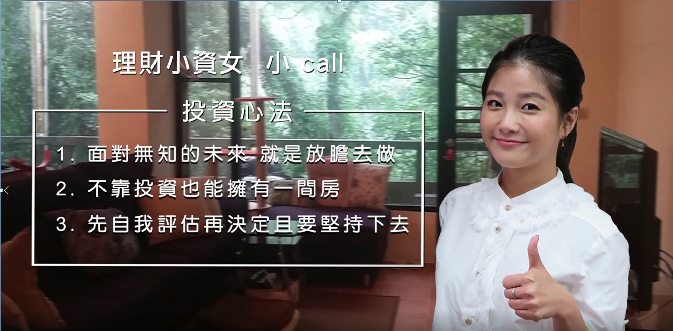 「行動決定一切!」小Call提到,許多人常腦袋空想,但從未下手執行。若不親自體會,永遠不了解事情的困難度。小Call以自身買房為例,買房慾望是第一步,自我衡量是第二步,持之以恆是第三步。她說,買房就是量力而為,事前的計畫及規劃,主要掌握自身能力,評估經濟狀況,才不會吃不消。