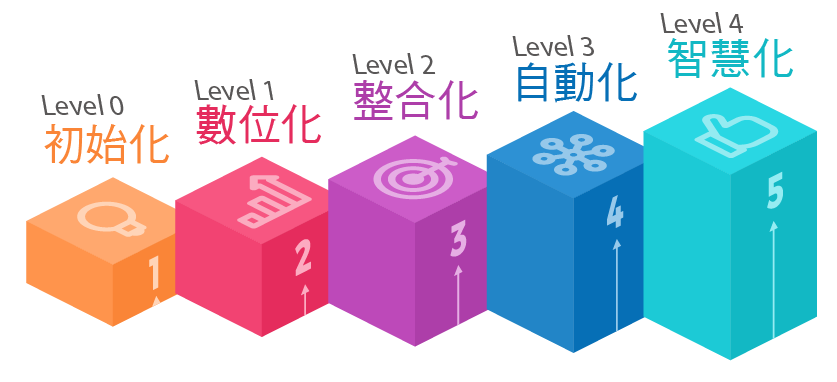 LEVEL 1:企業各部門開始利用數位工具產生收集數據,或利用資訊系統進行採購、存銷等業務。