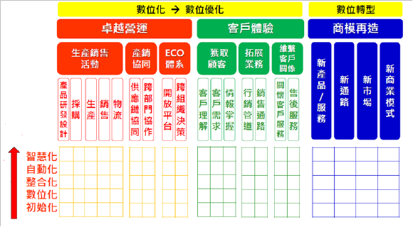 接下來,結合數位能力成熟度的五個階段,每一個價值活動的數位程度都可以分五個層級,以此衡量目前各單位數位化的程度及未來要達成的目標。